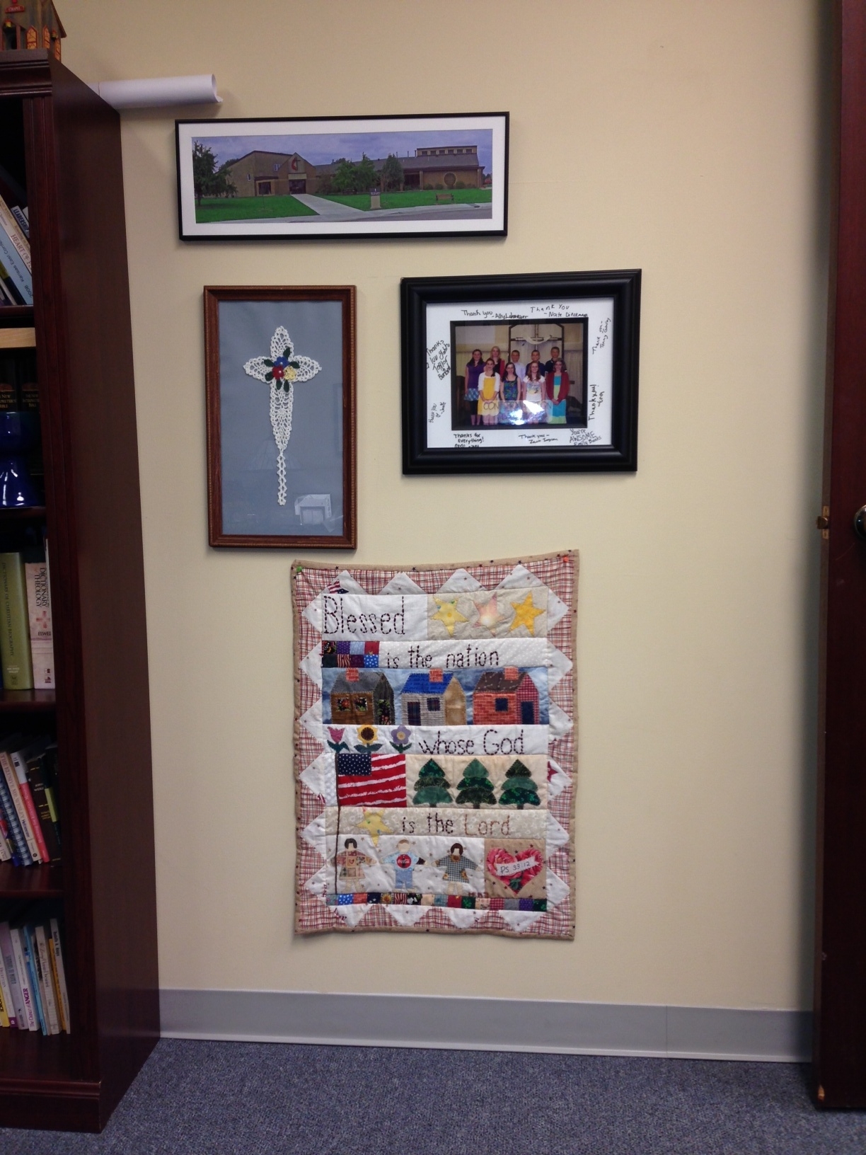 This is the wall art across from my desk. As a pastor I receive many lovely gifts and religious artifacts. The top picture is a panoramic taken by one of the FOGY’s at church. It makes the building look huge. It is not huge, but I must admit this little building is the most active church I have ever had the privilege to serve. The middle right picture was given to me three years ago when I co-lead the confirmation class with Mike Pearce. This was a great group of kids. Every now and then one of the confirmands wanders into my office and looks at the picture. The commentary runs from “how awful I look”, to “I remember what you said about the three kinds of grace.” I love that picture. To the left center is a crocheted cross a lovely church member picked up at a yard sale. She brought it into me and said, “When I saw this, I thought of you.” It is one of my favorites. At the bottom of this setting is a wall hanging done by a former member of a church in Atlantic Iowa. My little wall of art and pictures is a good reminder that church work is about people, relationships, forming young lives and love. What a blessing to work with all of these.
